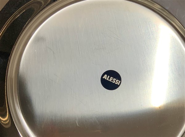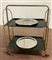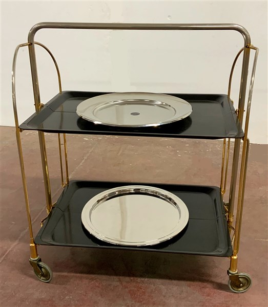 Lotto composto da un carrello pieghevole con struttura in metallo cromato e vassoi in laminato plastico cm (cm 67x78x42) unito a due vassoi in acciaio marcati Alessi (d cm max 37). Italia, seconda metà secolo XX. (difetti)