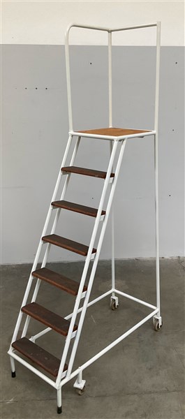 Scaletta da biblioteca con rotelle, struttura metallo smaltato bianco e pioli in legno. Italia, seconda metà secolo XX. (cm 45x208x102) (difetti)