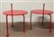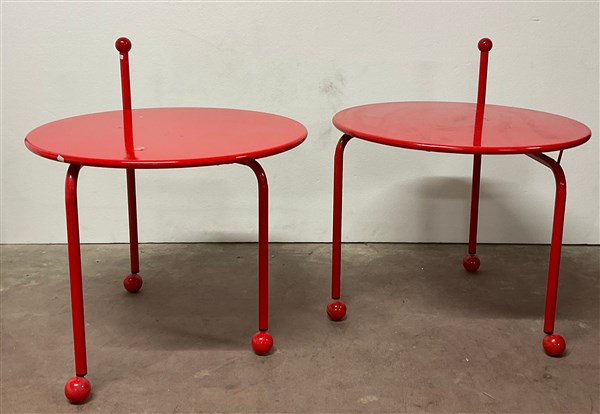 Coppia di tavolini tondi in metallo verniciato rosso con gambe richiudibili, pi
