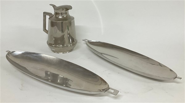 Lotto composto da una pesciera in acciaio marcata a incussione Sambonet (l cm 52) e una thermos in metallo argentato (h cm 22). Italia, secolo XX. (lievi difetti)
