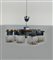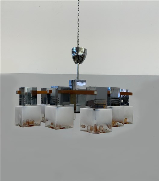 Lampada a sospensione a nove con struttura in metallo, diffusori in vetro incamiciato lattimo e pagliesco. Italia, anni '70. (lievi difetti e mancanze)