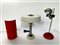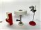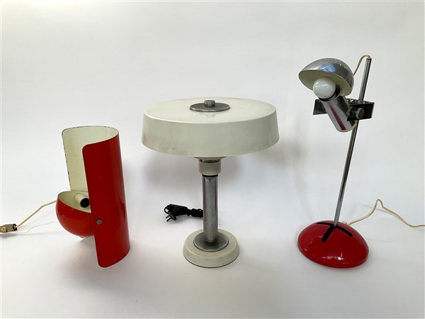 lampada da tavolo modello "T395". produzione Luci Cinisello, Italia, anni '70, metallo cromato e laccato rosso (h cm 50), unita a  una lampada da tavolo in metallo color arancio e bianco (h cm 32) e una in metallo cromato e bianco (h cm 40). Italia, seconda metà del secolo XX. (difetti)