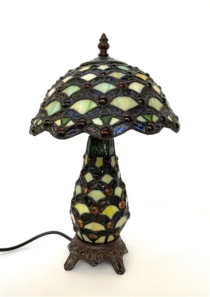 Lampada da tavolo a una luce con fusto e paralume in vetro policromo legato a piombo, base in metallo. Produzione recente. (h cm 38,5) (lievi difetti)