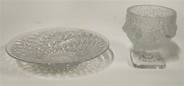 Lotto composto da una coppa in vetro soffiato in stampo decorato a rilievo con volatili e foglie, parzialmente acidato sulla superficie esterna e da un centrotavola in vetro soffiato in stampo trasparente incolore e iridato. Francia, seconda metà secolo XX. Firmati. (coppa cm h 14; centrotavola cm d 25) (lievi difetti)