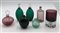Lotto composto da una coppia di vasetti della serie "Monofiori" di Laura de Santillana in vetro trasparente verde con tappo a ricciolo, un vasetto con tappo in vetro trasparente ametista chiaro, un vasetto in vetro trasparente verde, un vasetto di forma esagonale in vetro trasparente ametista chiaro con orlo verde, un vasetto globulare in vetro trasparente verde con orlo verde, firmati sotto la base "Venini" e un bicchiere in vetro massello trasparente incolore e ametista firmato sotto la base Tapio Wirkkala. Murano, seconda metà secolo XX. (h max cm 16) (difetti)