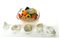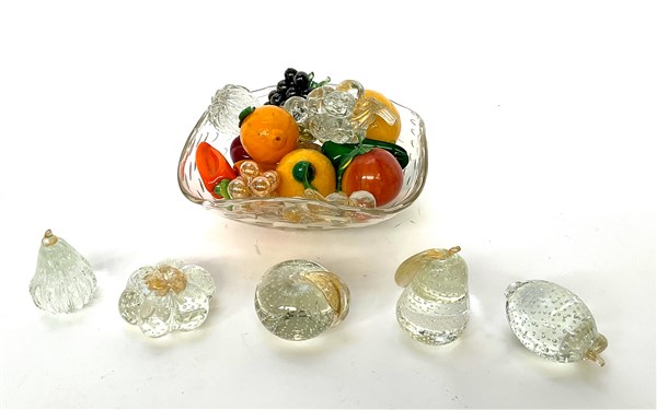 Centrotavola in vetro trasparente incolore con bolle eninclusione di foglia d'oro contenente numerosi frutti in vetro di fatture differenti. Italia, seconda metà secolo XX. (difetti e rotture)