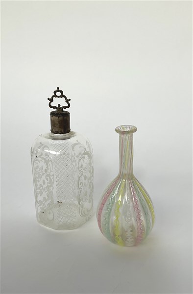 Manifattura di Murano, Lotto composto da una bottiglia con tappo in vetro trasparente incolore decorato alla mola di inizio secolo XX, e un vasetto in vetro soffiato trasparente incolore decorato in rosa, giallo, lattimo e verde di metà secolo XX. (h max cm 17,5) (lievi difetti)