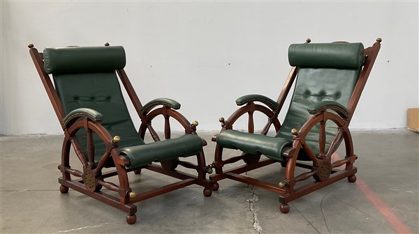 Coppia di poltrone con braccioli a guisa di timone, recanti targhe con iscrizioni "The Clermont, Baltimore, 1801" e "The Great Pacific, San Francisco, 1808". Struttura in mogano con inserti in ottone. (cm 58x91x96) (lievi difetti)