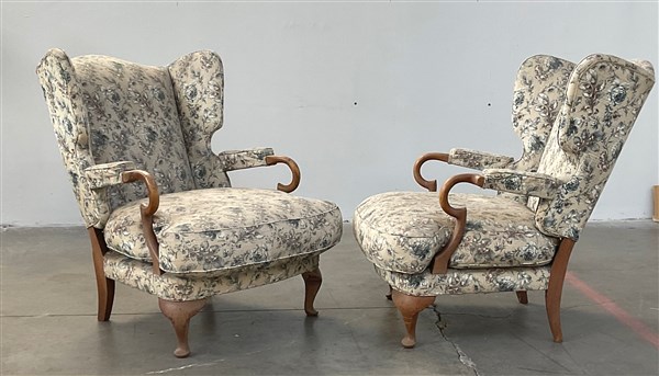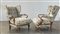 Coppia di poltrone imbottite e rivestite in tessuto floreale, struttura in legn