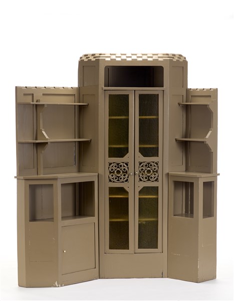 Mobile Déco ad angolo in tre parti asimmetriche con ripiani a giorno e settore centrale ad ante. Milano, 1925ca. Legno massello verniciato beige, vetro, midollino. (cm 184x212x60) (lievi difetti)