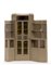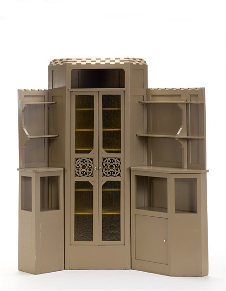 Mobile Déco ad angolo in tre parti asimmetriche con ripiani a giorno e settore centrale ad ante. Milano, 1925ca. Legno massello verniciato beige, vetro, midollino. (cm 184x212x60) (lievi difetti)