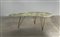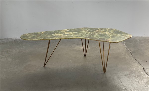 Tavolino da salotto con piano in onice sagomato e gambe in tubolare di ottone. Italia, anni '50/'60. (cm 130x45x68) (lievi difetti)