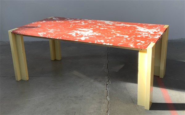 Tavolo con struttura in legno laccato ocra e metallo verniciato bianco, piano in marmo rosso venato. Italia, anni '80. (cm 190x73x98) (difetti)