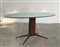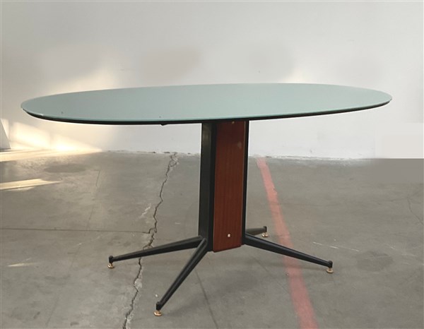 Tavolo ovale con piano in vetro azzurro, struttura in ferro verniciato nero e fusto in legno. Italia, anni '50. (cm 174x81x83)