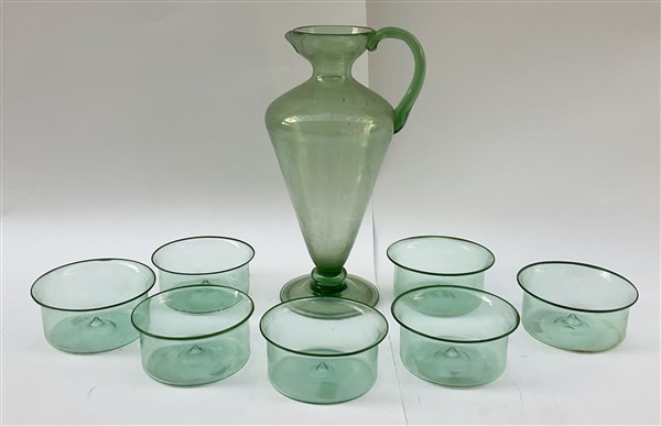 Manifattura di Murano. Lotto composto da un versatoio e sette ciotoline da macedonia in vetro soffiato trasparente verde. Inizio secolo XX. (h cm 29) (difetti)