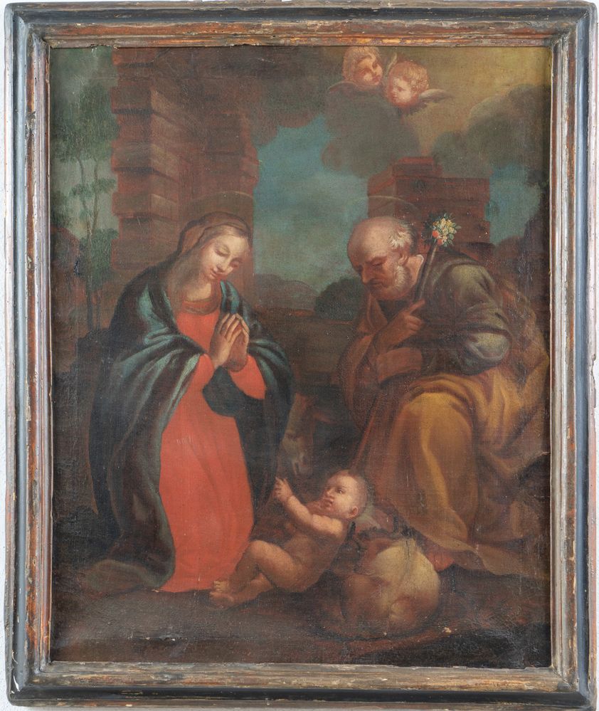Maestro del XVIII secolo. "Sacra famiglia". Olio su tela. Cm 75x61.