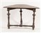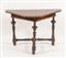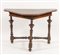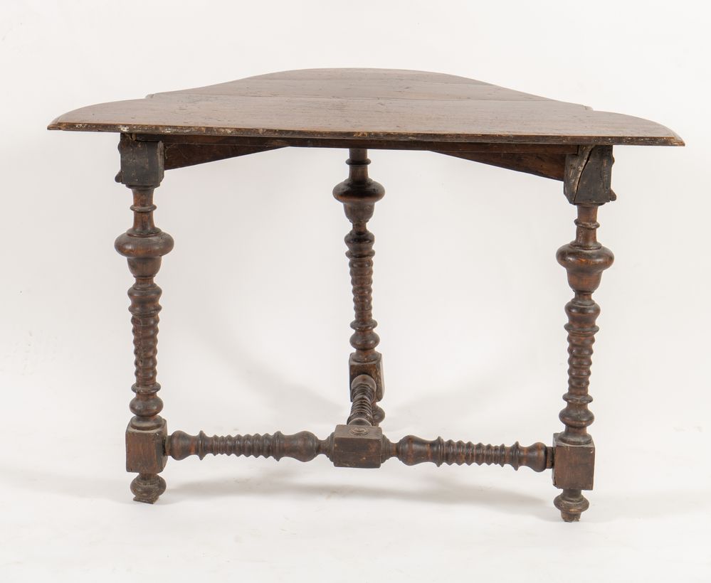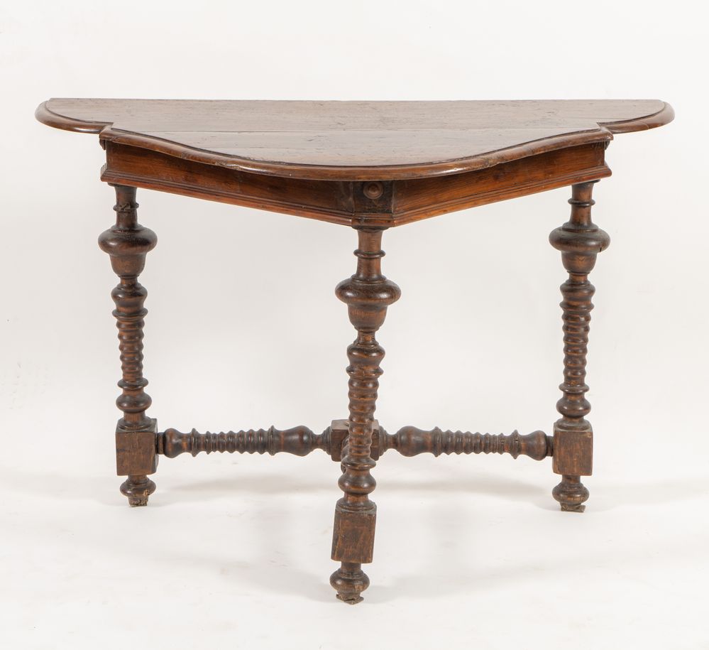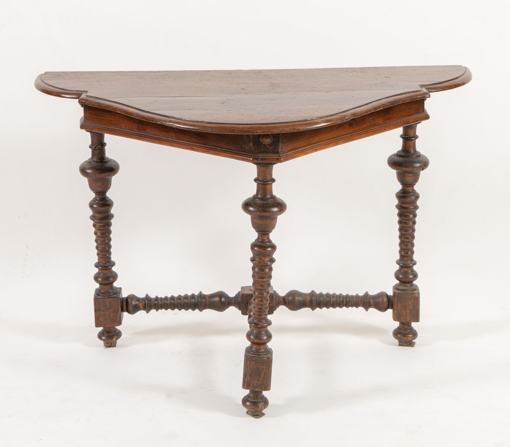 Piccola consolle in massello di noce. Romagna, ultimo quarto del XVII secolo. Piano di forma mistilinea. Sostegni e traverse tornite. Cm 75x111x57.