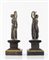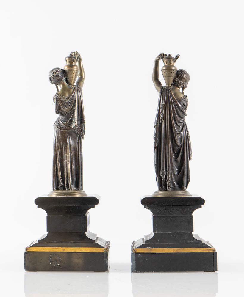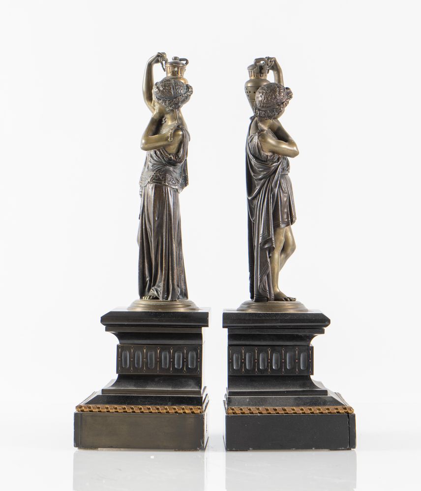 Coppia di sculture in bronzo raffiguranti figure femminili che sorregge brocca, di gusto classico, poggianti su basi in marmo nero del Belgio. Francia, ultimo quarto del XIX secolo. Con base: cm 42x15,5x13. Scultura: cm 27,5x7,5. (restauri nelle basi)