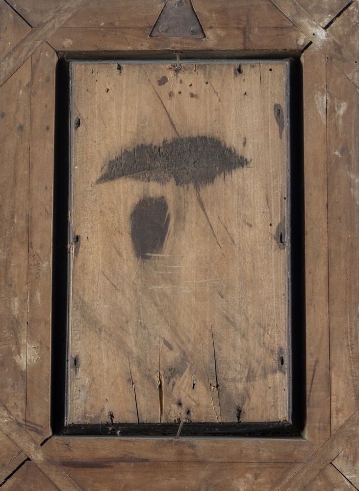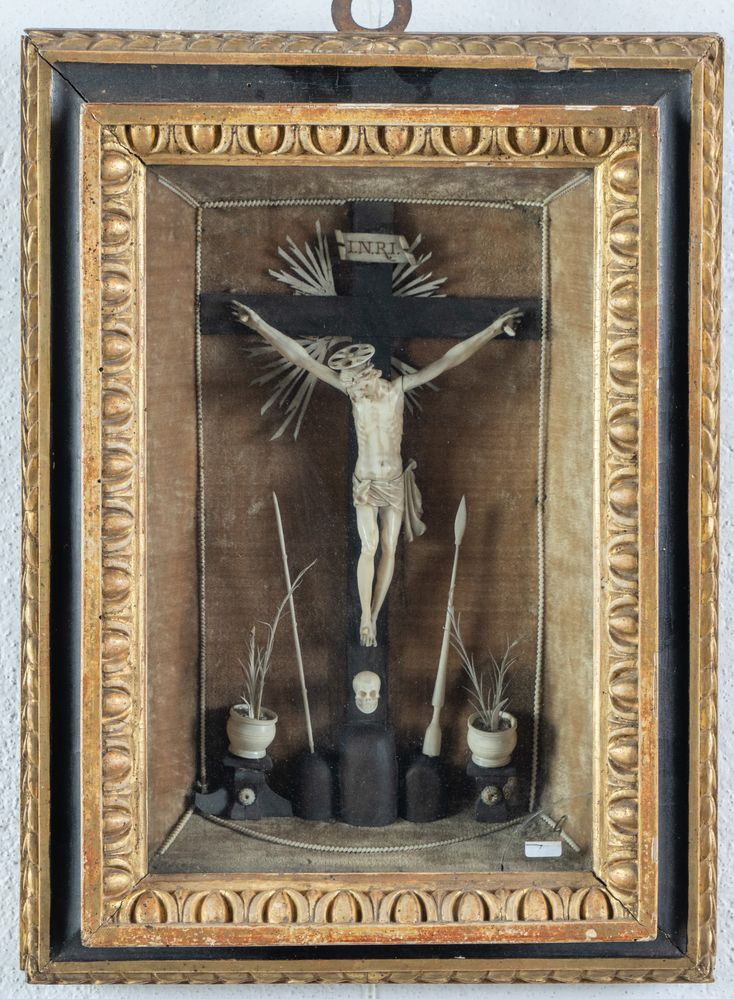 Teca contenente crocifisso in materiale prezioso e alla base i simboli della passione. Lombardia, XVIII secolo. Cm totali: 43,5x31x8,5.