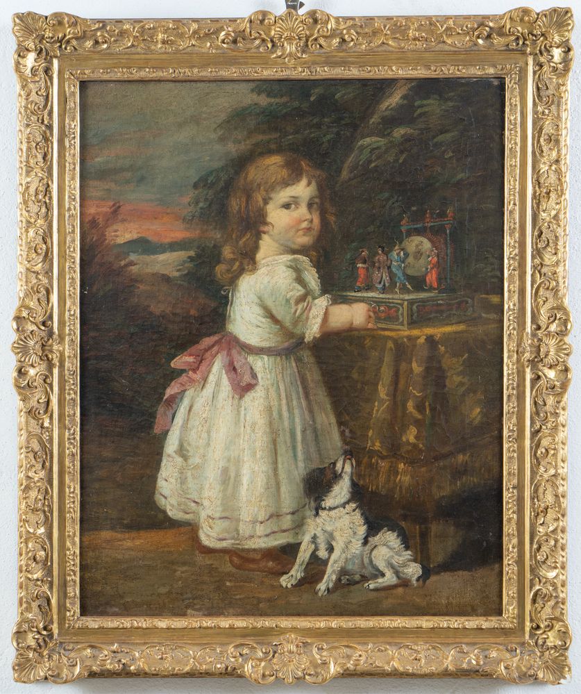 Maestro del XIX secolo. "Bambina con cane". Olio su tela. Cm 83x65.