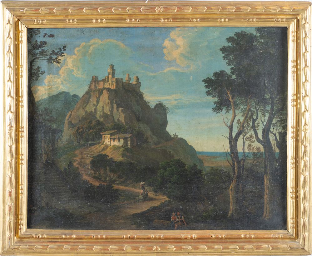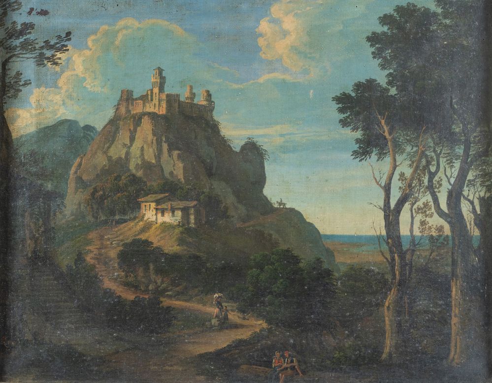Maestro della fine del XVIII secolo - inizio del XIX secolo. "Paesaggio di fantasia". Tempera grassa su tela. Cm 57x71.