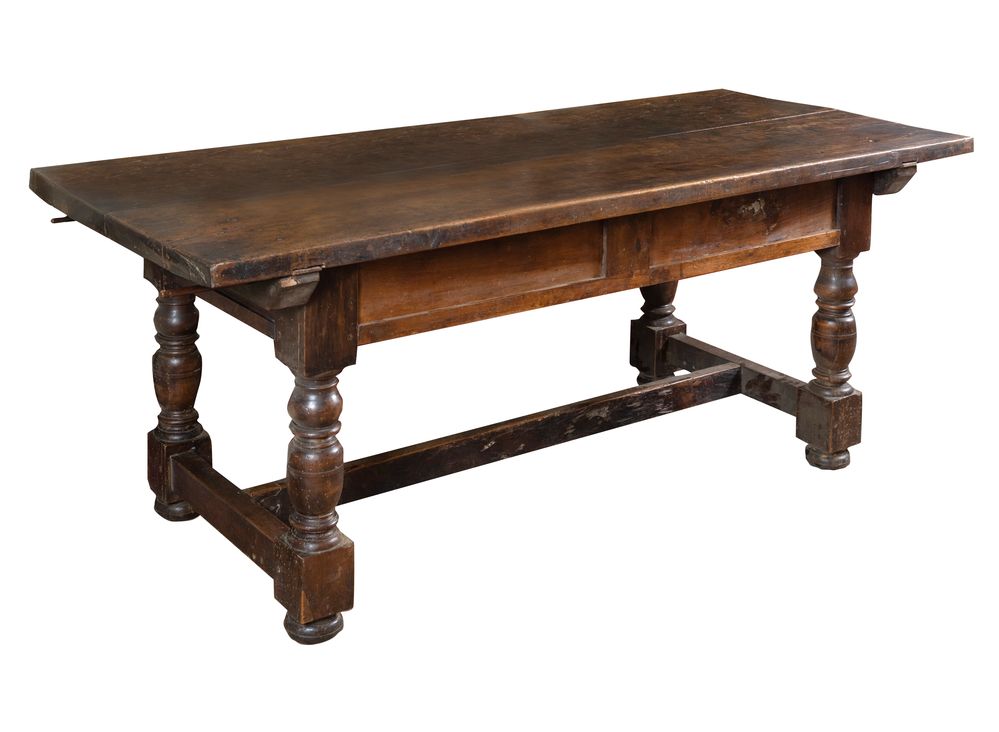 Tavolo a rocchetto in massello di noce. Bologna, metà del XVII secolo. Reca sostegni a balaustra tornita raccordati alla base da traverse. Cm 83,5x209,5x92. (restauri e rifacimenti)