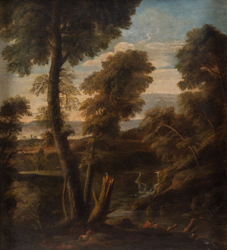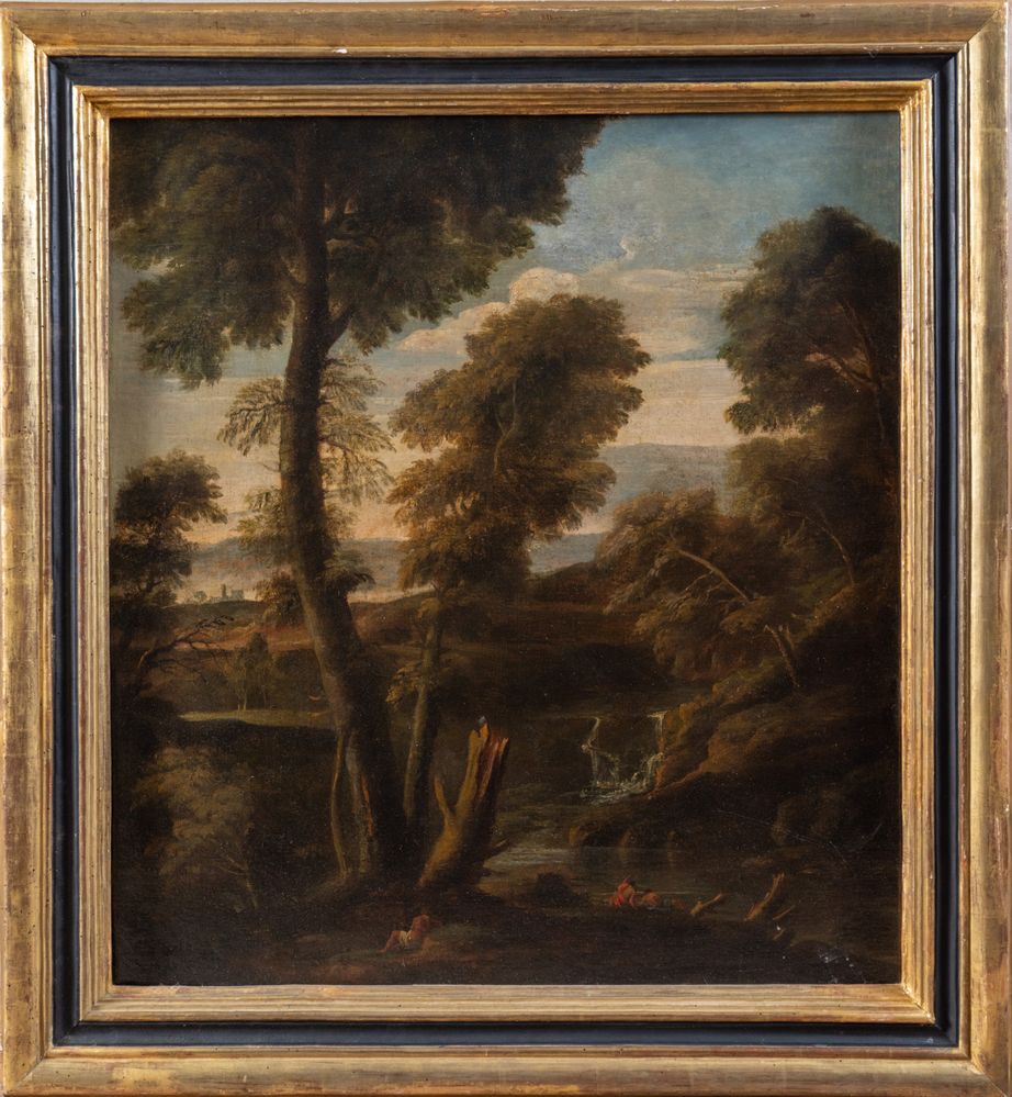 Seguace di G. Dughet. "Paesaggio con figure". Olio su tela. Cm 83,5x74.