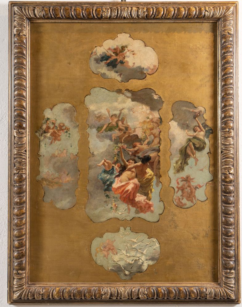 GIOACCHINO PAGLIEI (Subiaco 1852 – Roma 1896) "Allegoria". Olio su carta intelata. Cm 90x66. Bozzetto da soffitto per le decorazioni murali degli ambienti del Villino Folchi a Roma.