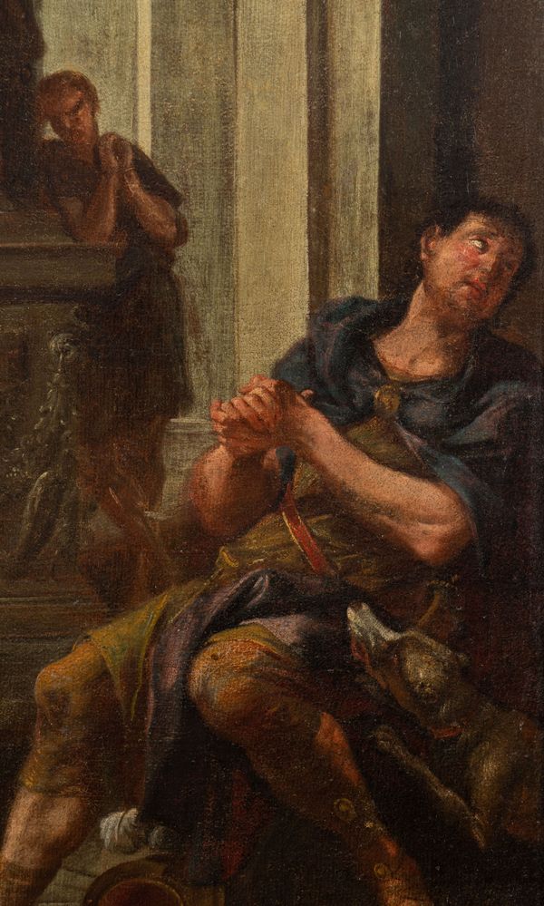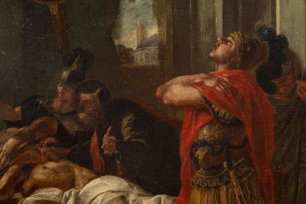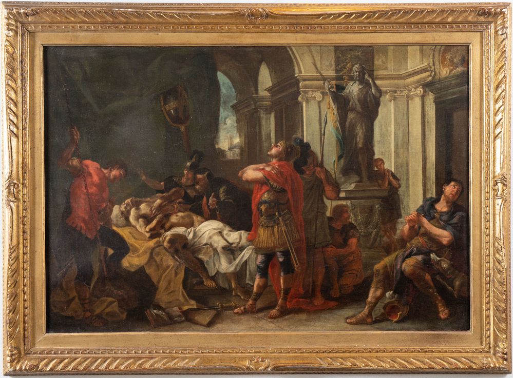 Maestro veneto del XVIII secolo. "Morte di Archimede". Olio su tela. Cm 70x105.