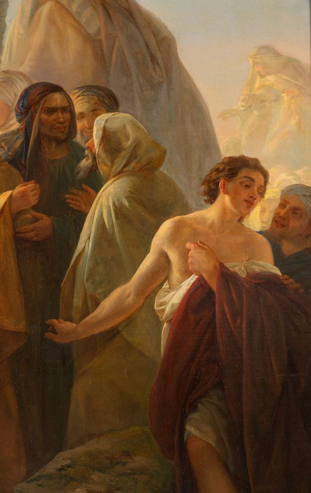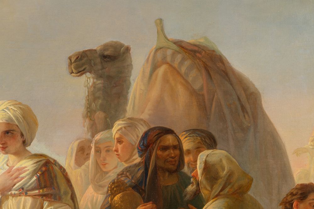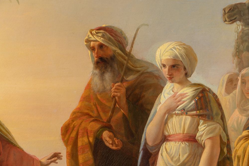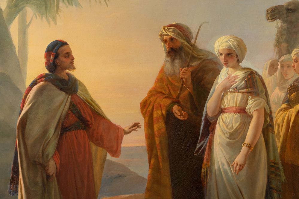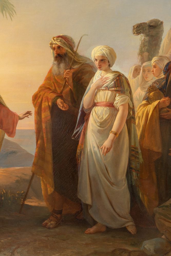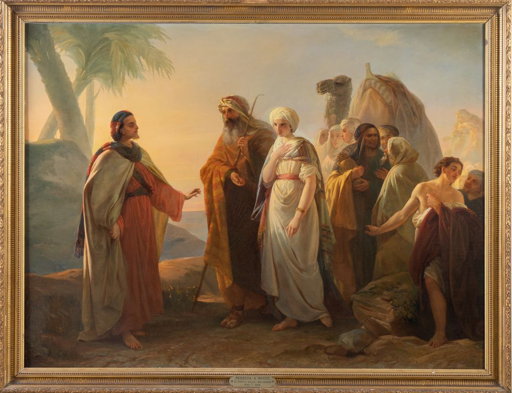 ENRICO SAVINI (Bologna 1832 - 1869) "Rebecca e Isacco". Olio su tela. Cm 119x159.