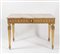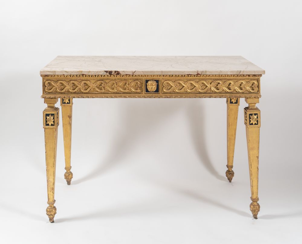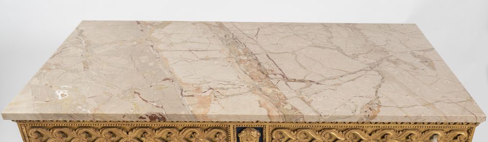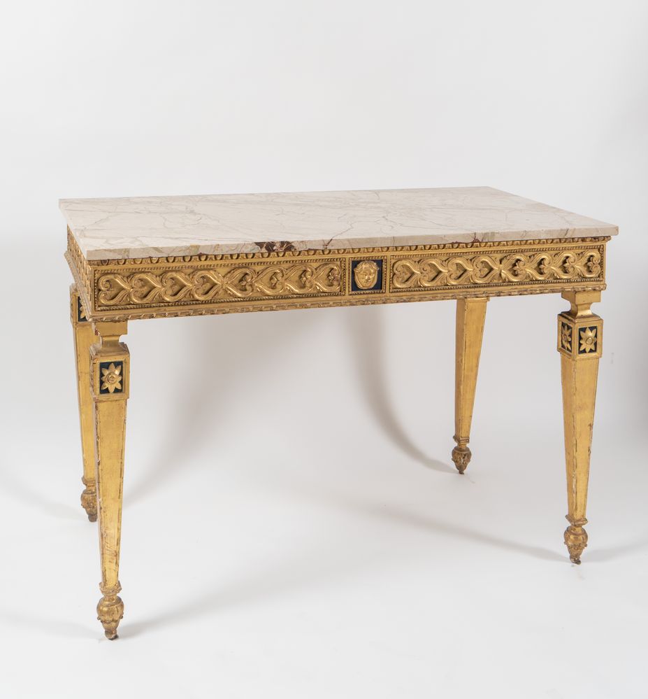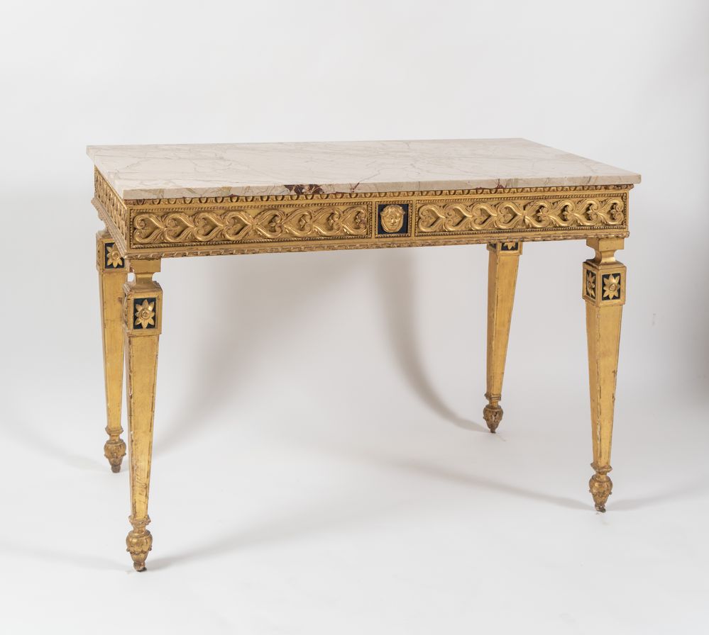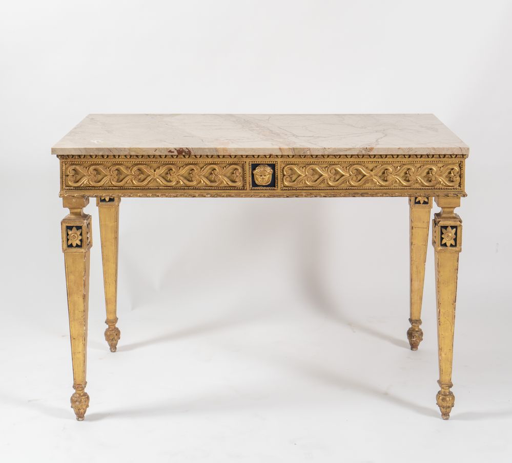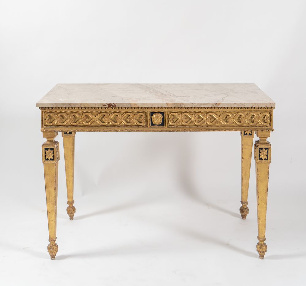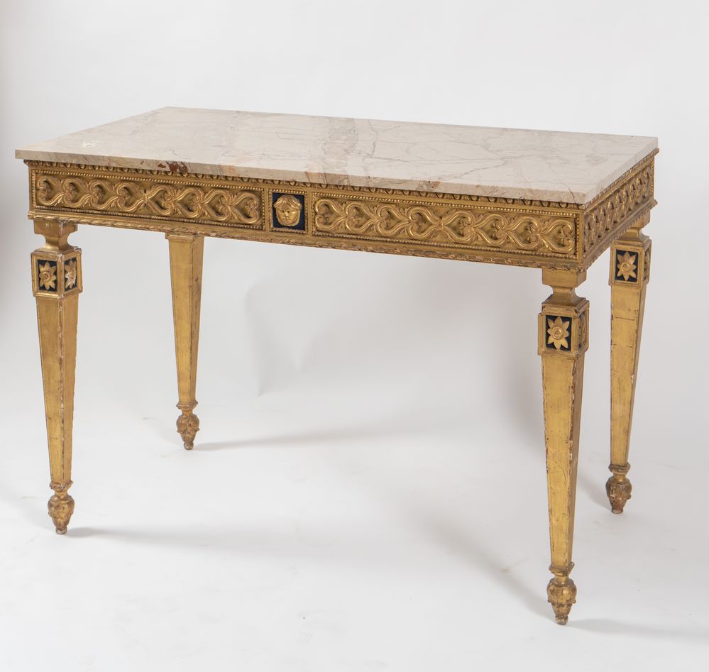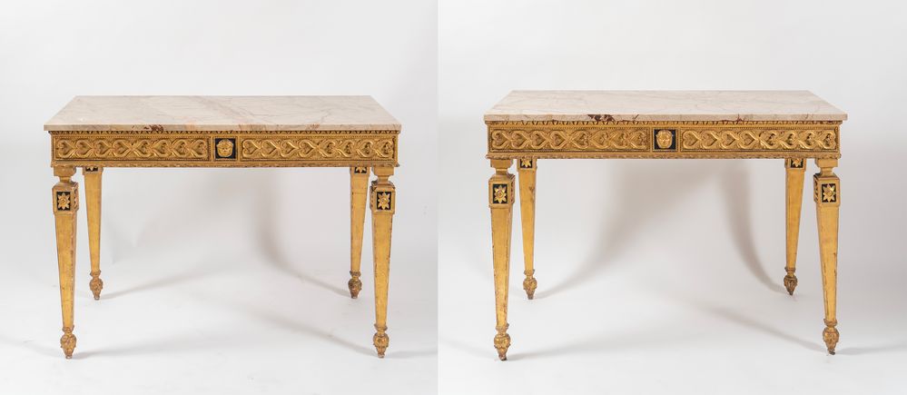 Coppia di consolle in legno intagliato e dorato. Veneto, ultimo quarto del XVIII secolo. Recano fascia con motivi a riccioli contrapposti e testa muliebre al centro. Sostegni a tronco di piramide rovesciata impreziositi da dadi con rosette. Recano piano in marmo. Cadauna di cm 87x125x68. (difetti)