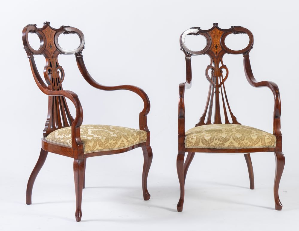 Coppia di sedie in mogano. Impero Austroungarico, fine del XIX secolo - inizio del XX secolo. Filettate ed intarsiate in acero e varie essenze. Imbottite in tessuto damascato giallo. Stile liberty. Cadauna di cm 105x60x60.