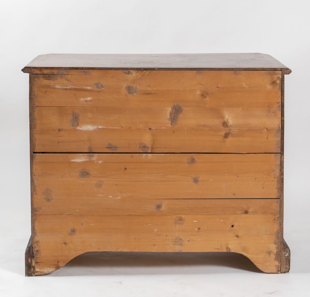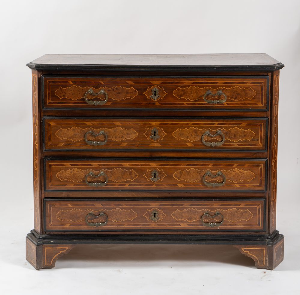 Cassettone canterano in massello di noce, con intarsi in acero e ciliegio. Lombardia/Piemonte, ultimo quarto del XVII secolo. Il primo cassetto cela cassettiera lastronata e intarsiata anch'essa. Sul fronte reca formelle intarsiate in radica. Sul coperchio reca rosa dei venti incorniciata a motivi a riccioli contrapposti. Fianchi riccamente intarsiati anch'essi. Maniglie in bronzo originali e coeve. Cm 111x125x58. (difetti)
