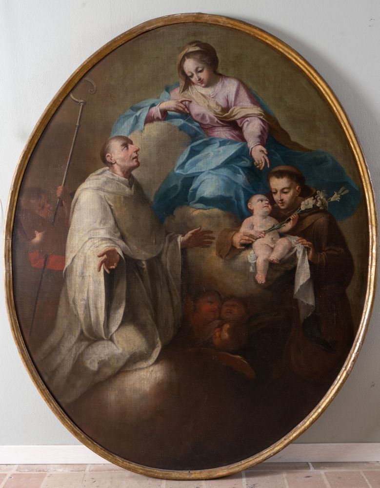 Ambito del Cignaroli, XVIII secolo. "Madonna con San Bernardo da Chiaravalle e Sant'Antonio da Padova". Olio su tela. Cm 162x132.