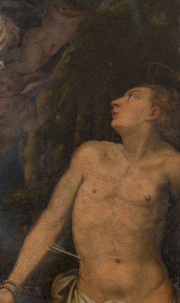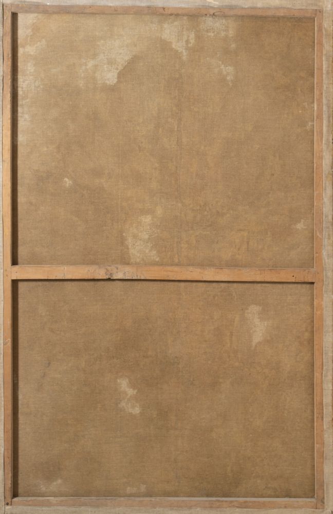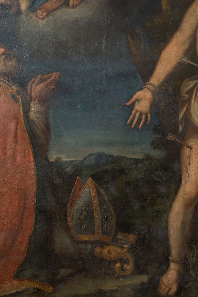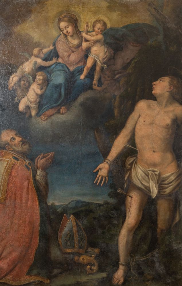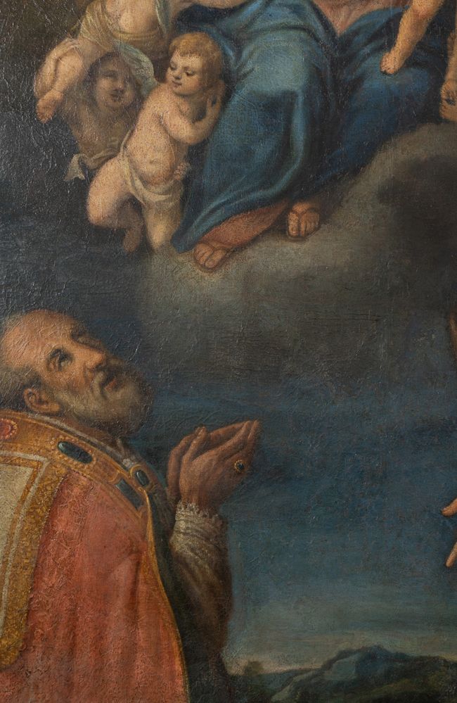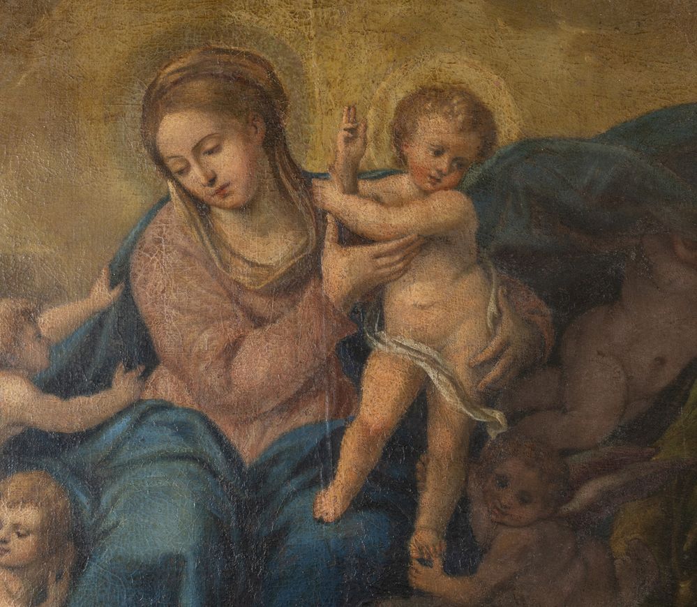 Maestro del XVII secolo. "Madonna in gloria con santi". Olio su tela. Cm 207x135. (restauri)
