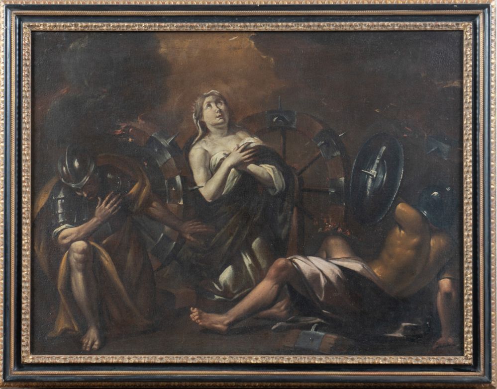 Maestro del XVII secolo. "Martirio di Santa Caterina". Olio su tela. Cm 71,5x97,5.
