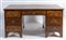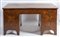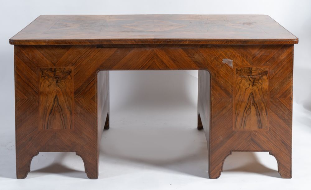 Scrittoio da centro lastronato in radica e rigatino di noce con filettature in ciliegio. Emilia, fine del XVIII secolo. Reca sette cassetti sul fronte e tiretto a scomparsa. Reca piedi a mensola cordonati e piano leggermente aggettante, cordonato anch'esso. Cm 83x157,5x82.