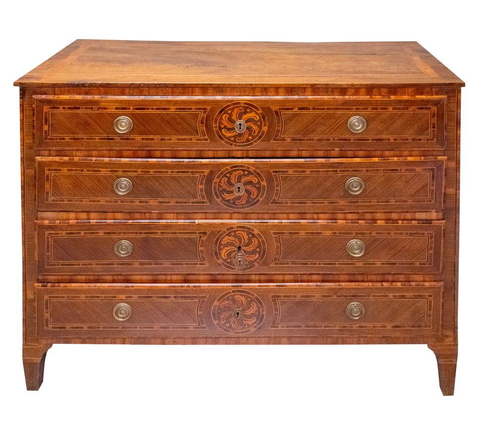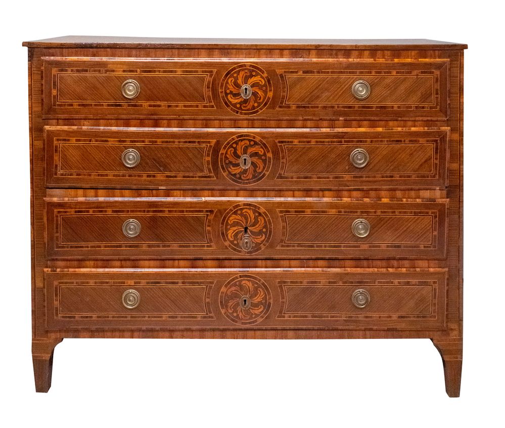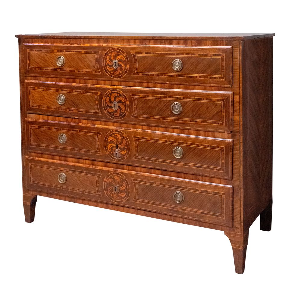 Cassettone Luigi XVI lastronato e filettato in rigatino di noce, frutto e acero. Emilia, seconda metà del XVIII secolo. Reca motivi a rosone al centro dei cassetti, piano in massello filettato e fianchi lastronati a spina di pesce. Cm 110,5x136,2x57,5.