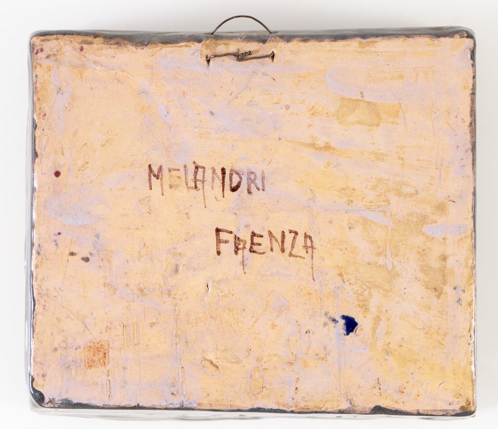PIETRO MELANDRI (Faenza 1885 – 1976) “Veliero”. Formella in ceramica a rilievo smaltata in policromia e a lustri metallici. Cm 20,5x23,5x6,5. Al retro opera firmata Melandri Faenza.