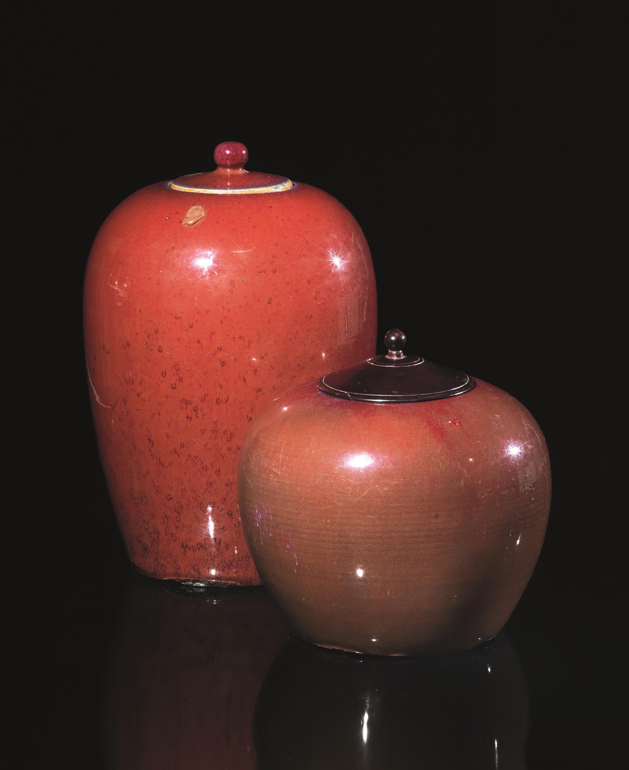 Due vasi sangue di bue con coperchio, Cina sec. XIX, un coperchio in legno...
