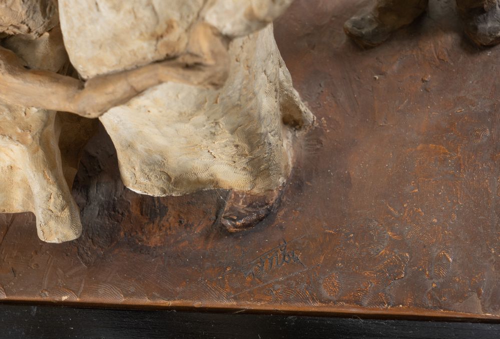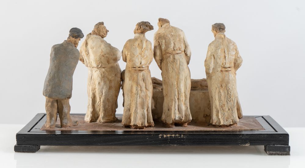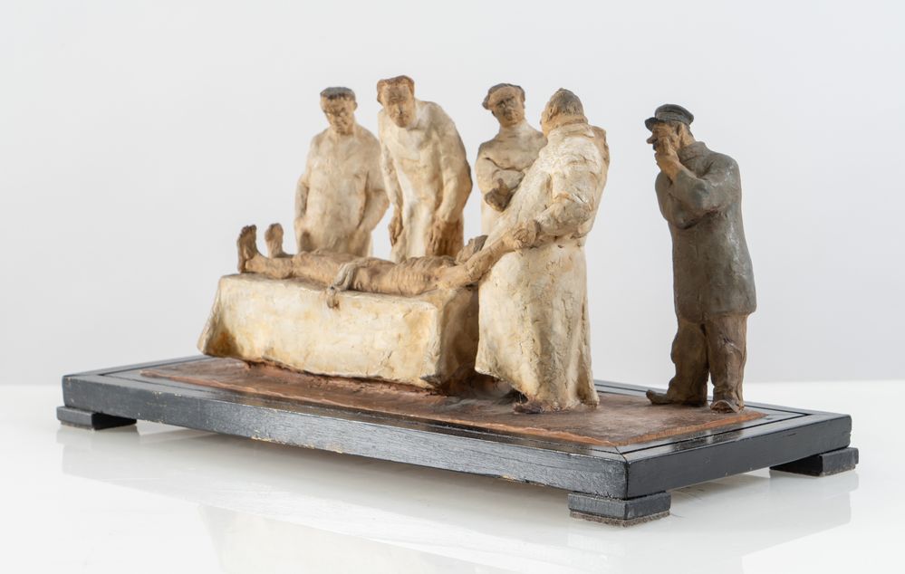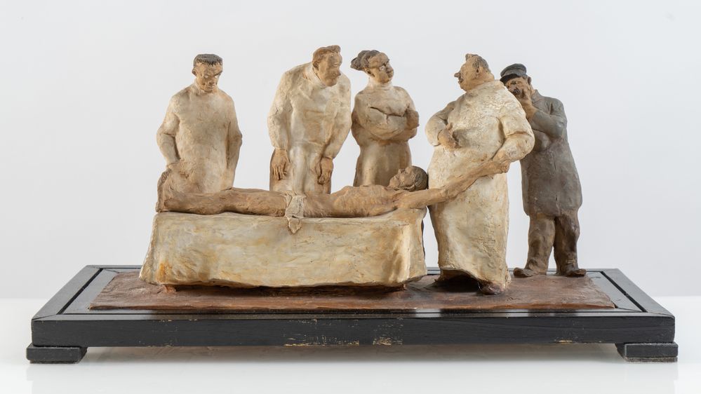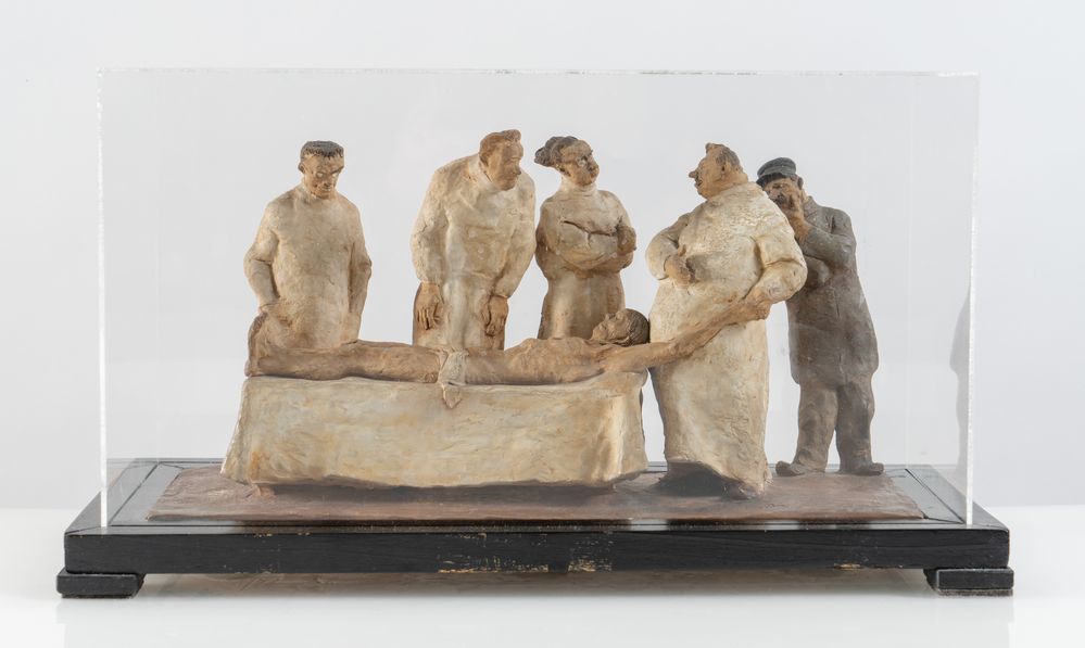 CLETO TOMBA (Castel San Pietro Terme 1898 - Bologna 1987) "Lezione di anatomia", 1933. Scultura in terracotta policroma. Cm 35x17x13. Alla base opera firmata e datata Tomba 933 XII. Pubblicazioni: L. Bertacchini (a cura di), Cleto Tomba, 2001, p.173