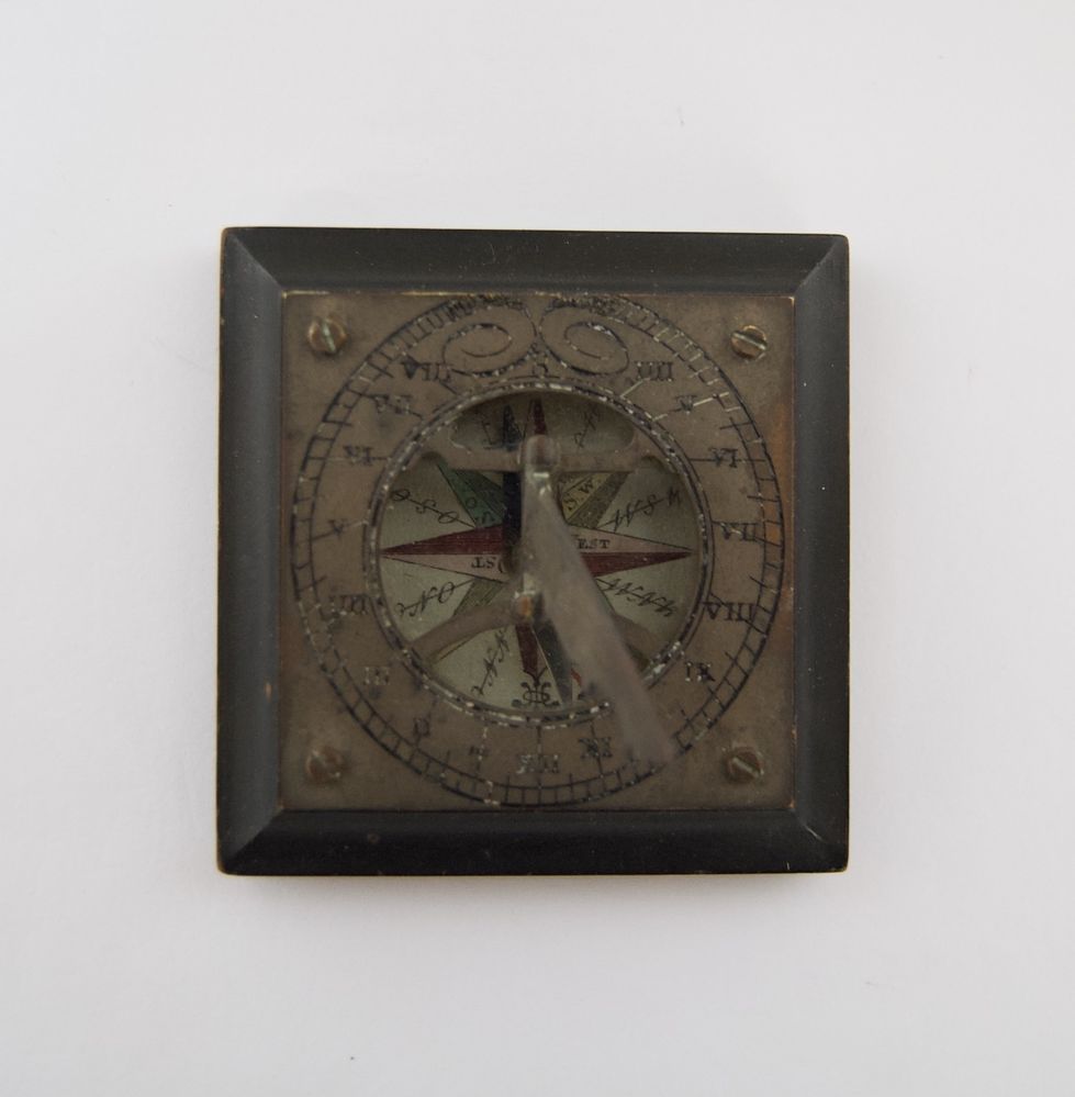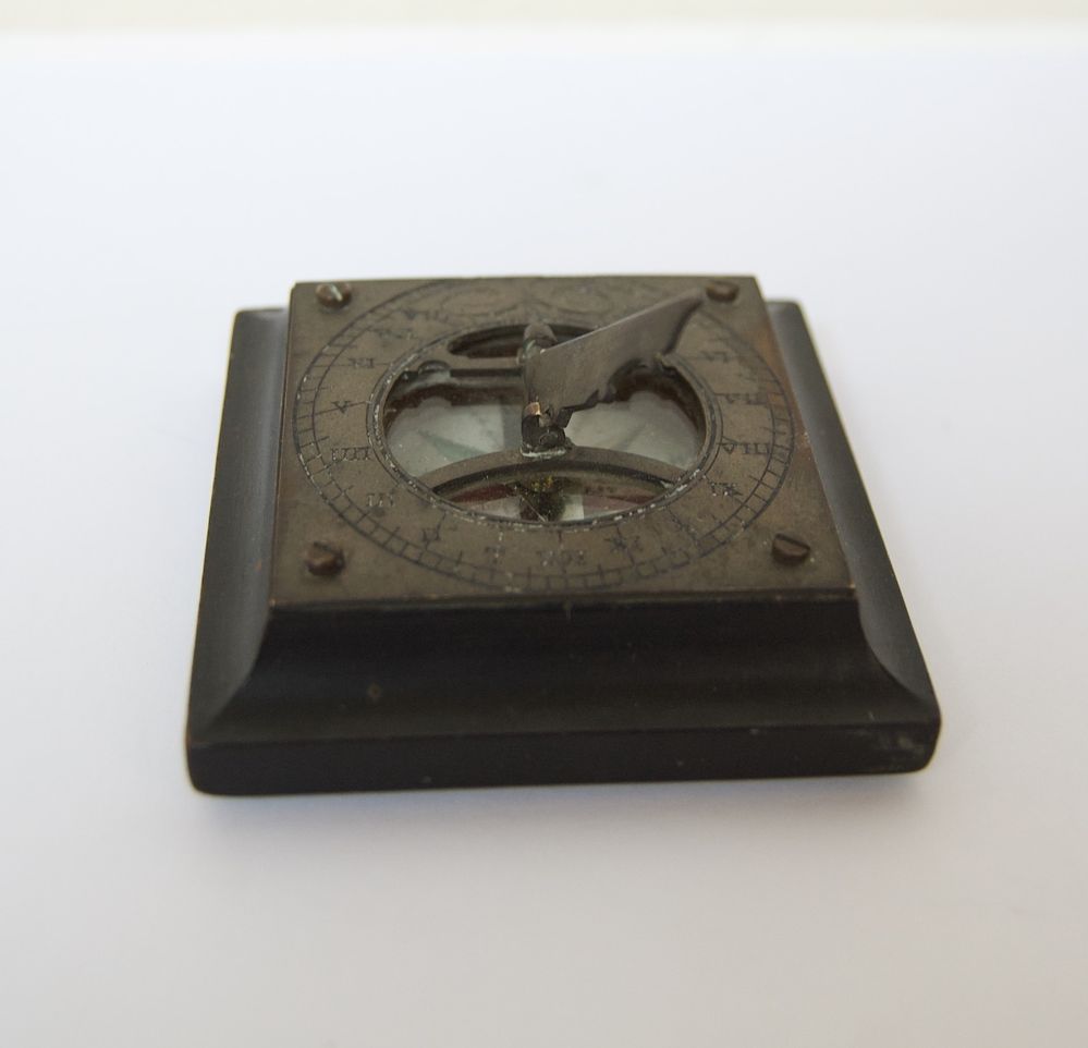 Orologio solare in legno e bronzo argentato. XIX secolo. Cm 4,5x6,4x6,4.