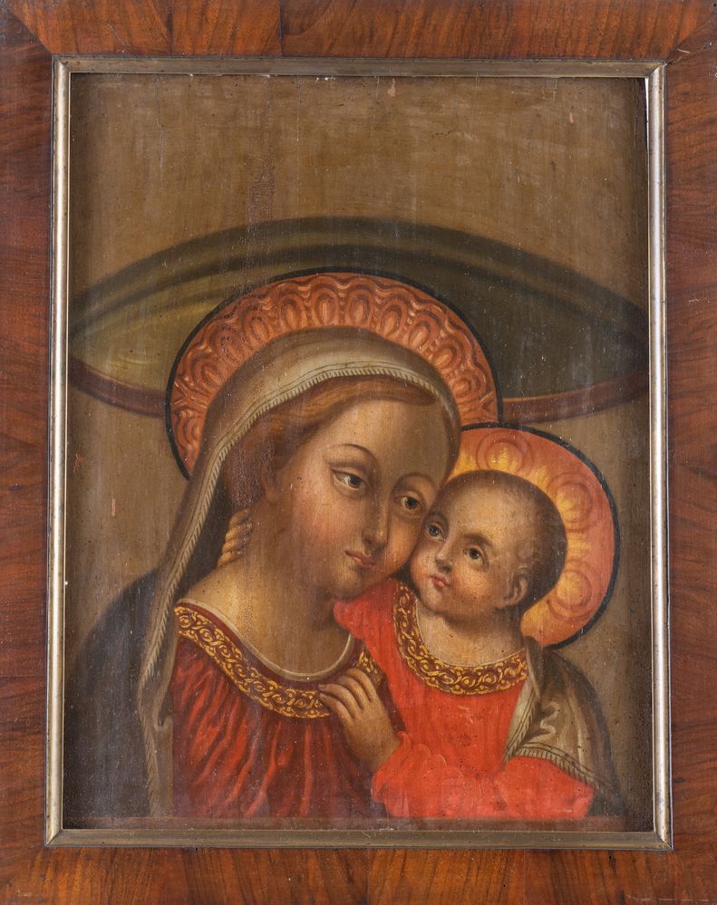 Maestro del XVII secolo. "Madonna con bambino". Olio su tavola. Cm 49x37,5.