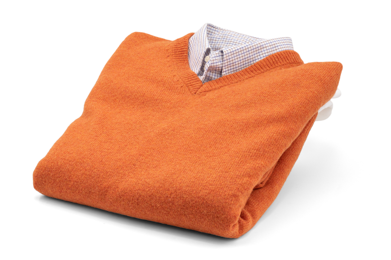 Maglione arancione, camicia a quadretti, t-shirt di lana