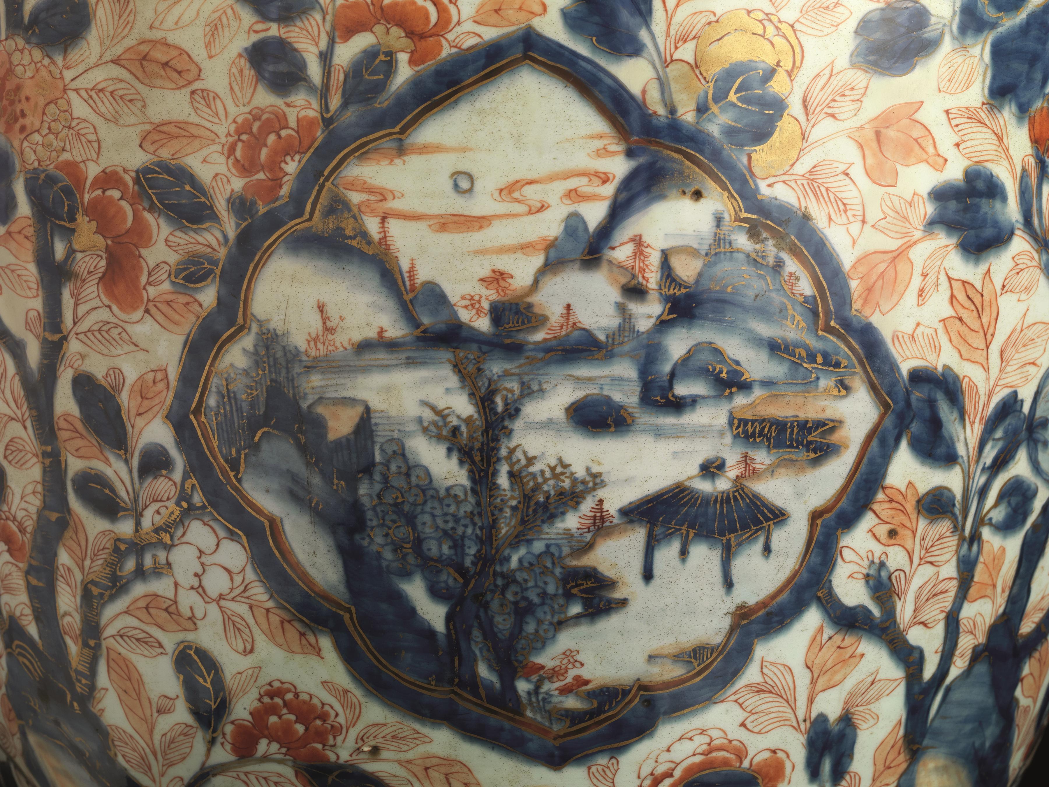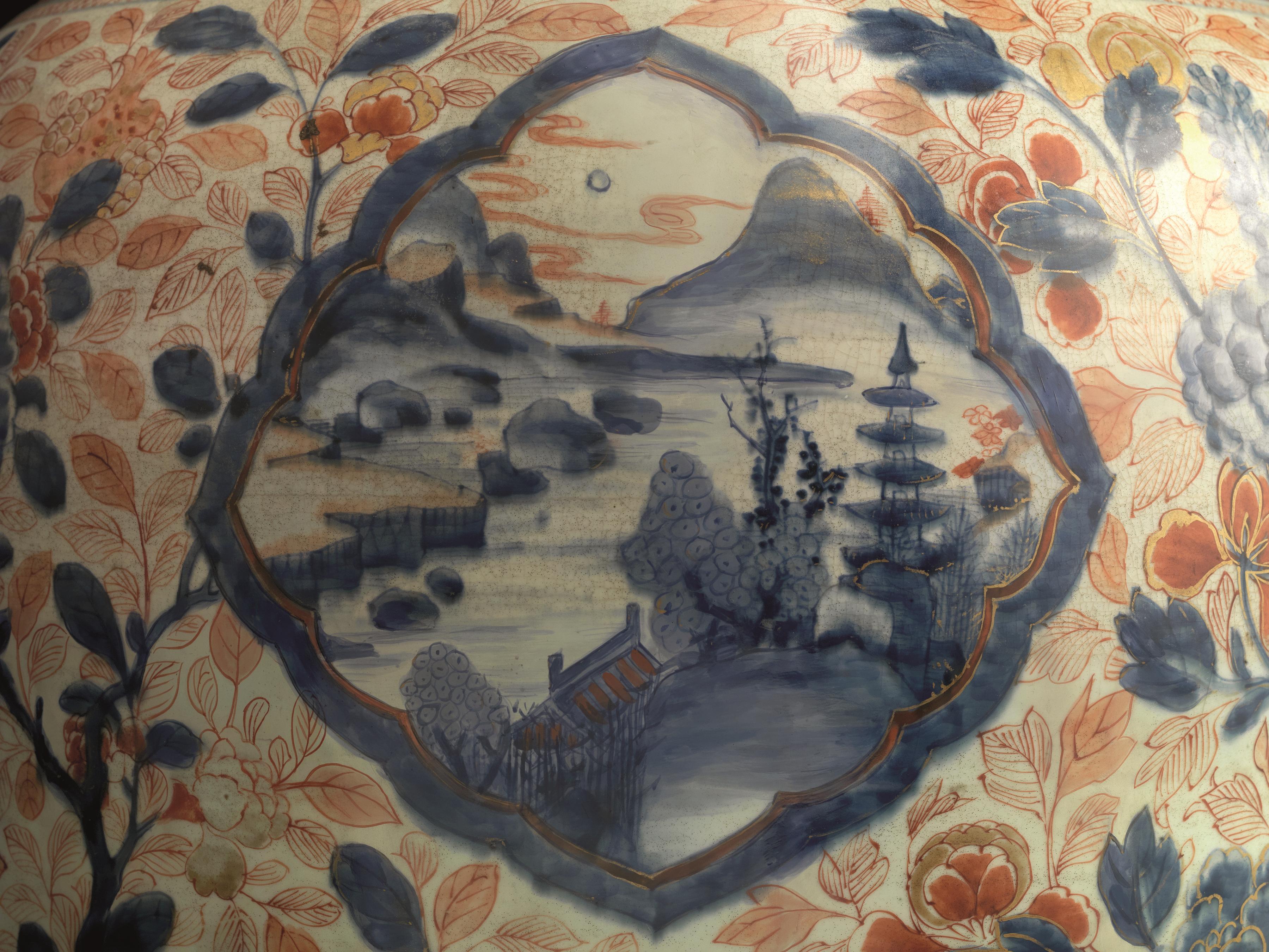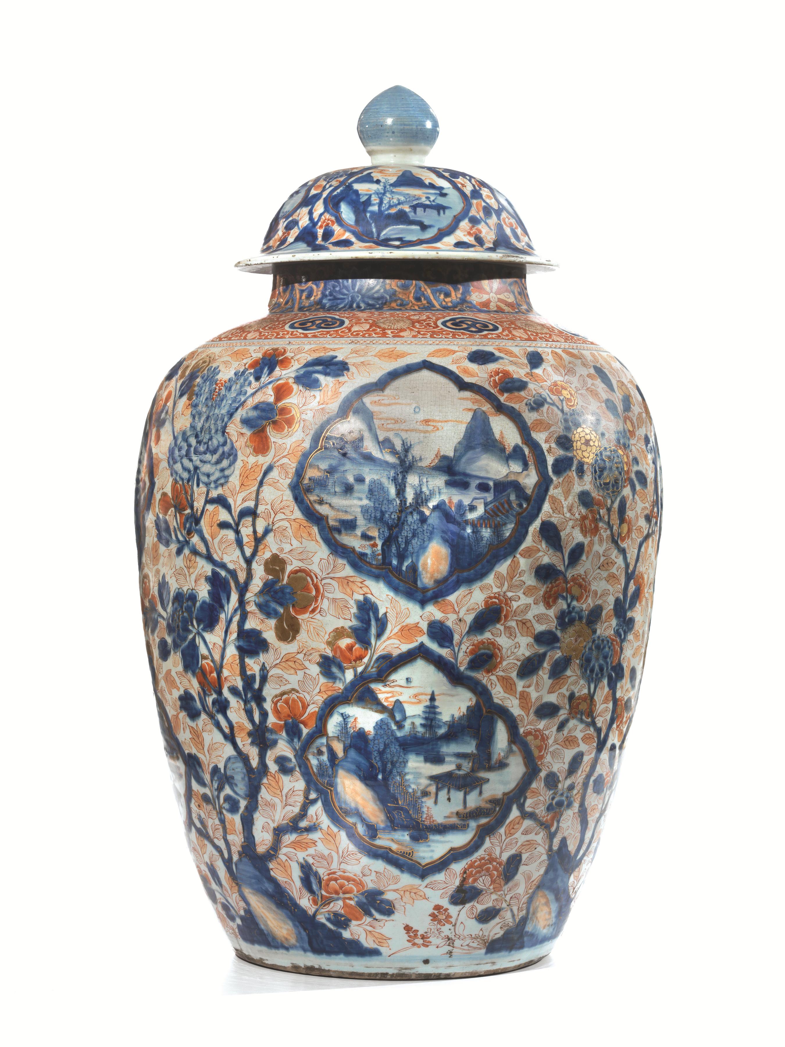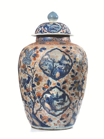 Grande potiche con coperchio, Cina sec. XVIII, in porcellana Imari, finemente dipinta a ramage fioriti e con otto riserve romboidali decorate a paesaggi, il collo con decoro ruyi, il coperchio con quattro ulteriori riserve, alt. cm 82, restauro