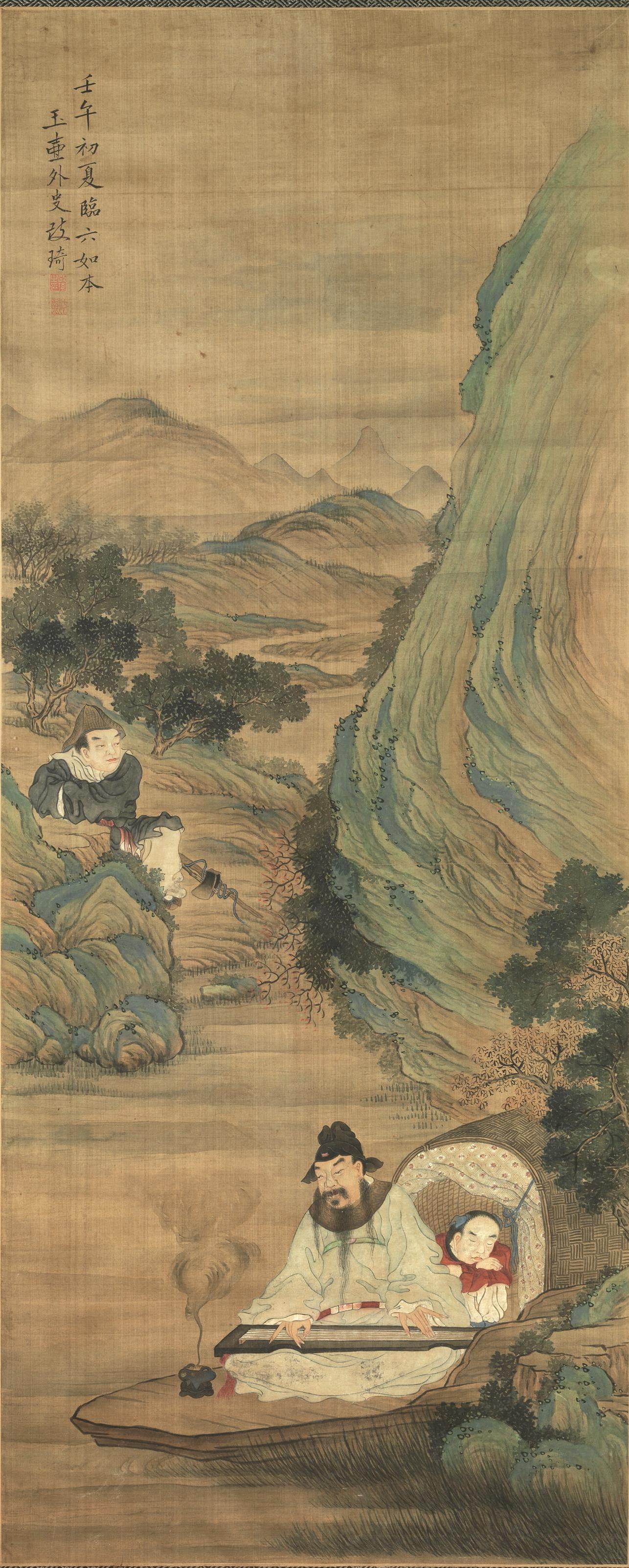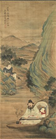 Dipinto su seta Cina dinastia Qing sec. XIX, raffigurante musicista in un paesaggio montuoso, cm 135x54