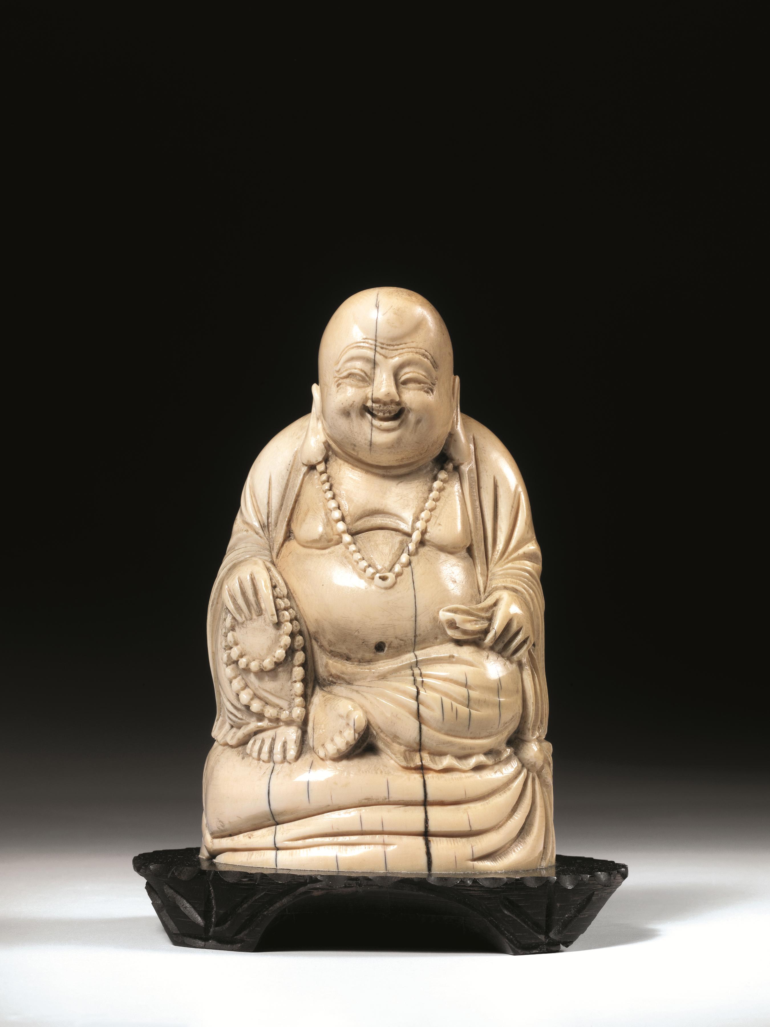 Buddha, Cina sec. XIX, in avorio, reggente una collana, su base in legno, alt. cm 13,2