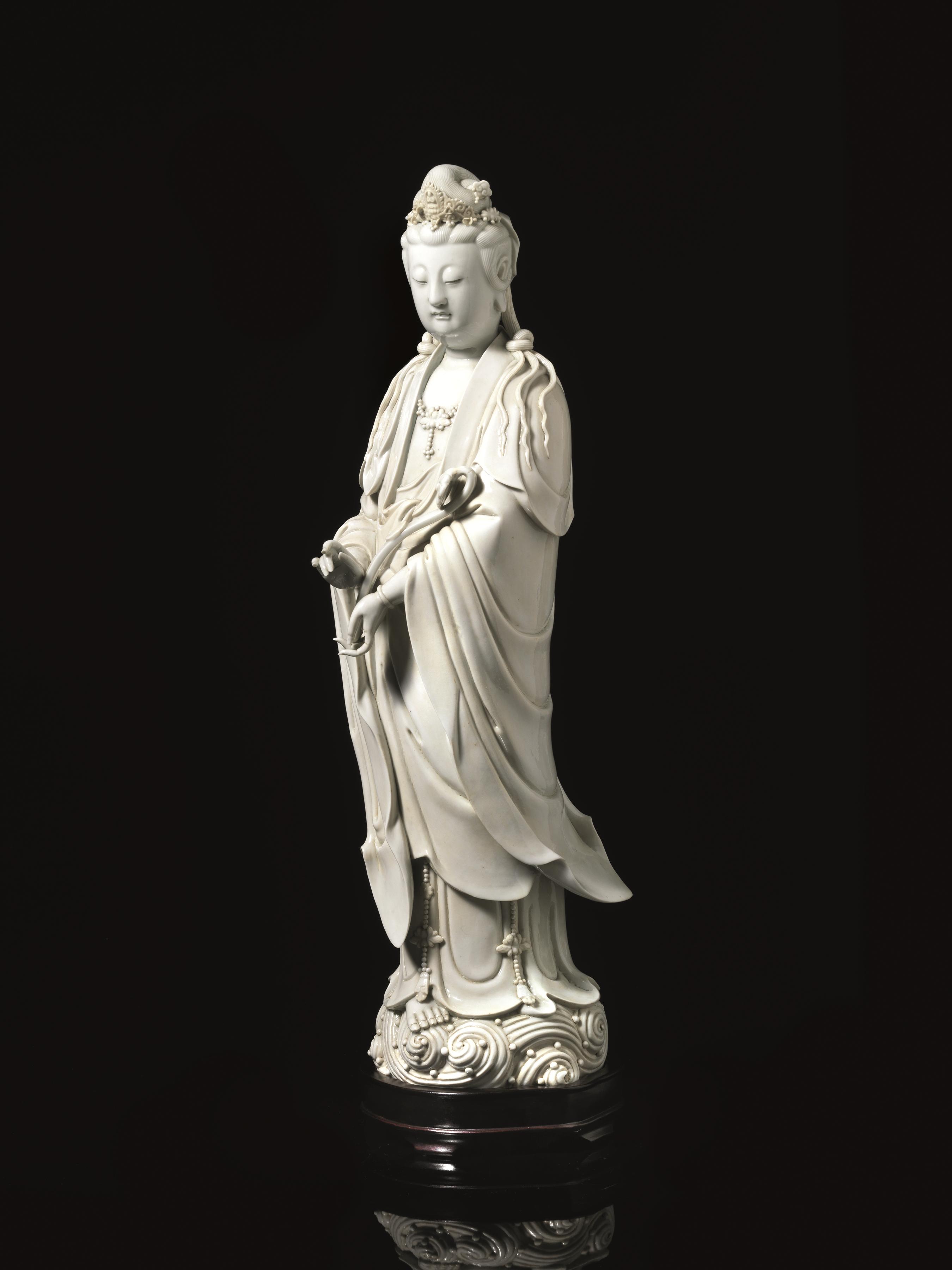 Scultura Cina sec. XIX, in porcellana bianca Dehua, raffigurante Guanyin reggente scettro ruyi, reca marchio Boji Yuren (Fisherman) al retro, alt. cm 51,5