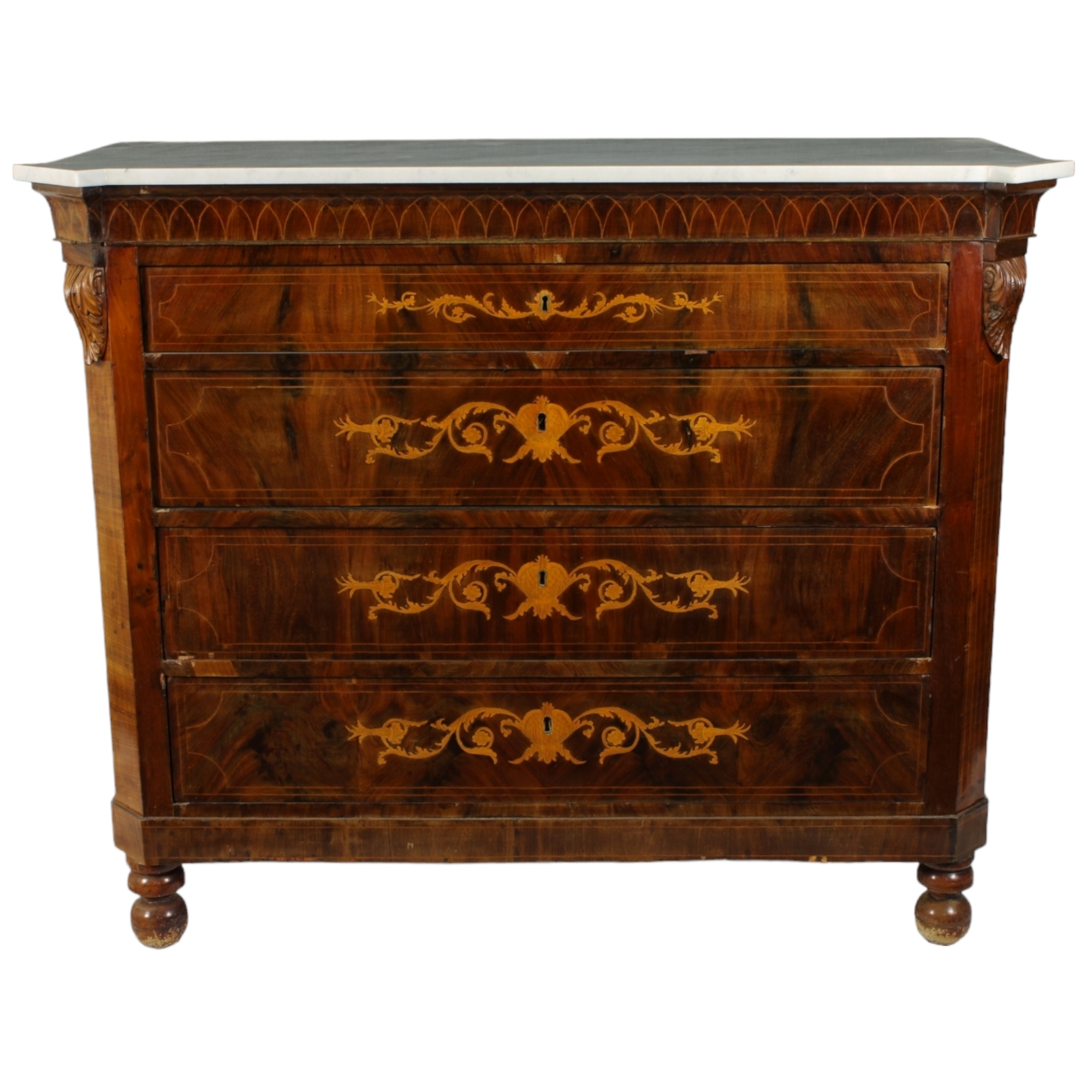 CASSETTONE IN PIUMA DI MOGANO piano in marmo bianco non coevo il fronte presenta 4 tiretti decorati da tarsia centrale dentro doppia filettatura XIX secolo Sicilia h cm 113 x 138 x 56
