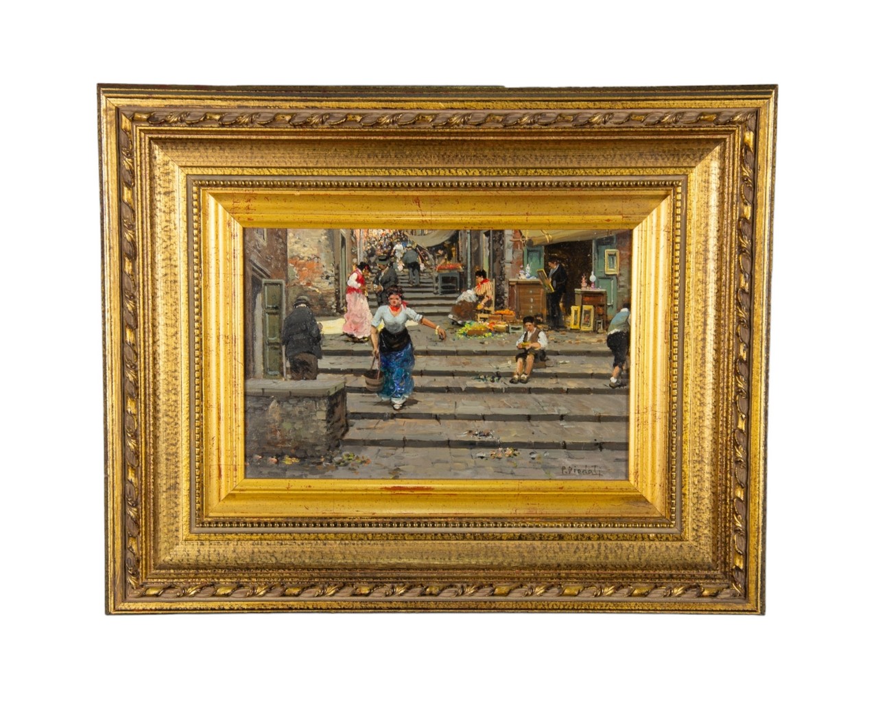 DIPINTO OLIO SU TELA Raff Lunga scalinata di quartiere popolare con personaggi firmato in basso a d/x P.Diodati XX secolo h cm 39 x 50 / h cm 19 x 29,5